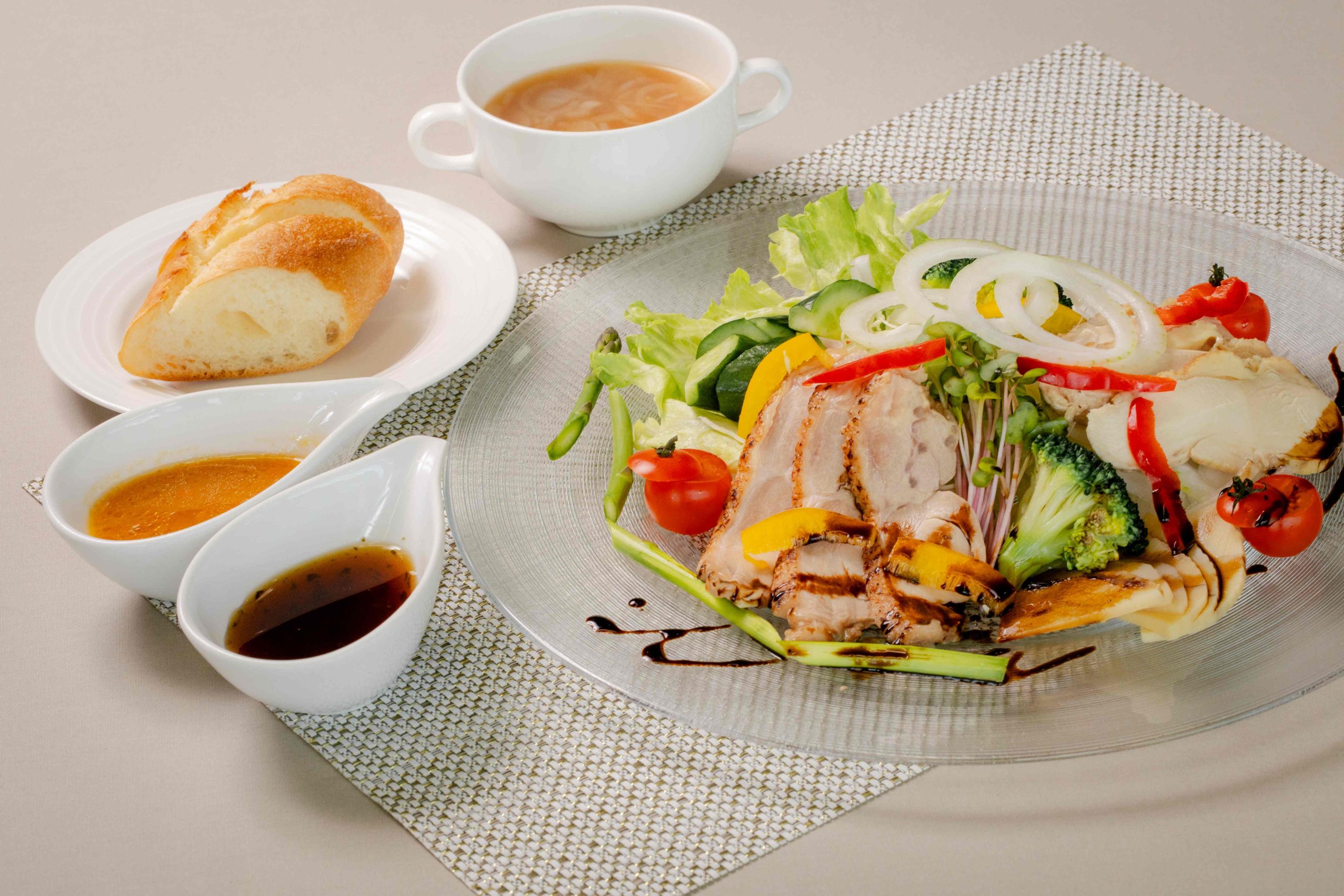 旨みのある百日鶏をしっとり仕上げ、新鮮野菜と盛り合わせた満足感のあるサラダプレート。